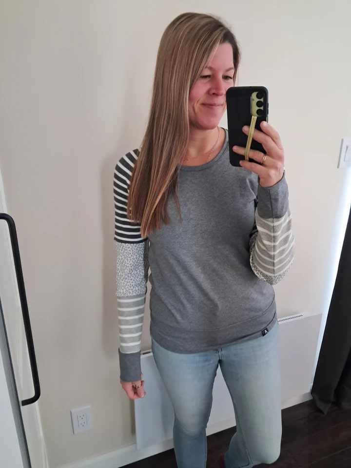 Corps kaki avec bas des manches patchwork gris, noir et crème.