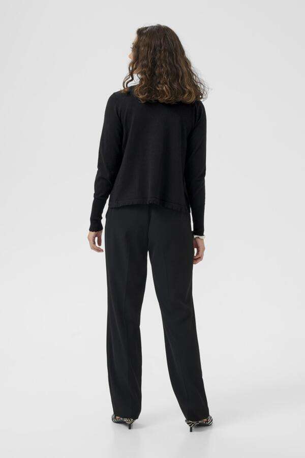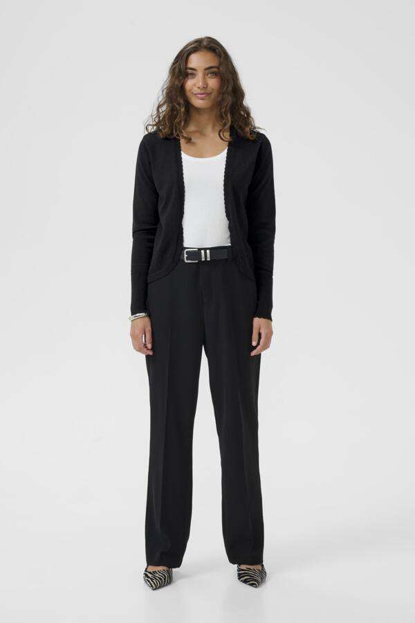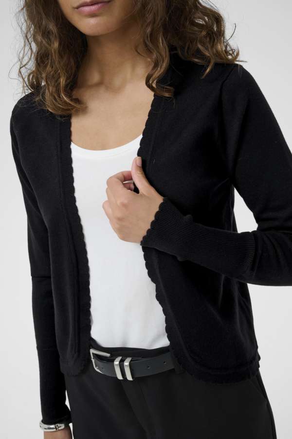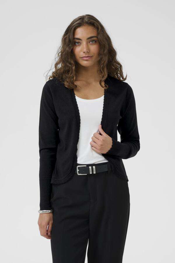 Boléro à manches longues en tricot doux. Jolie finition frison tout le tour de l'encolure, du bas et des manches.
