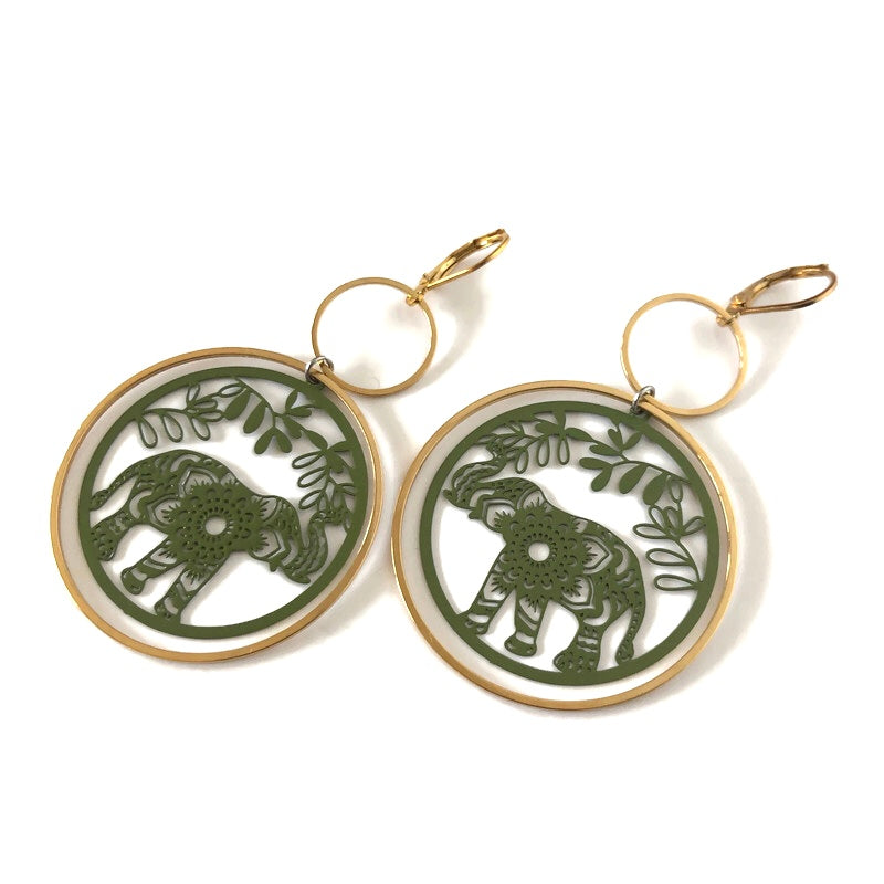 Estampe métal éléphant kaki, anneaux et crochets acier inoxydable doré.