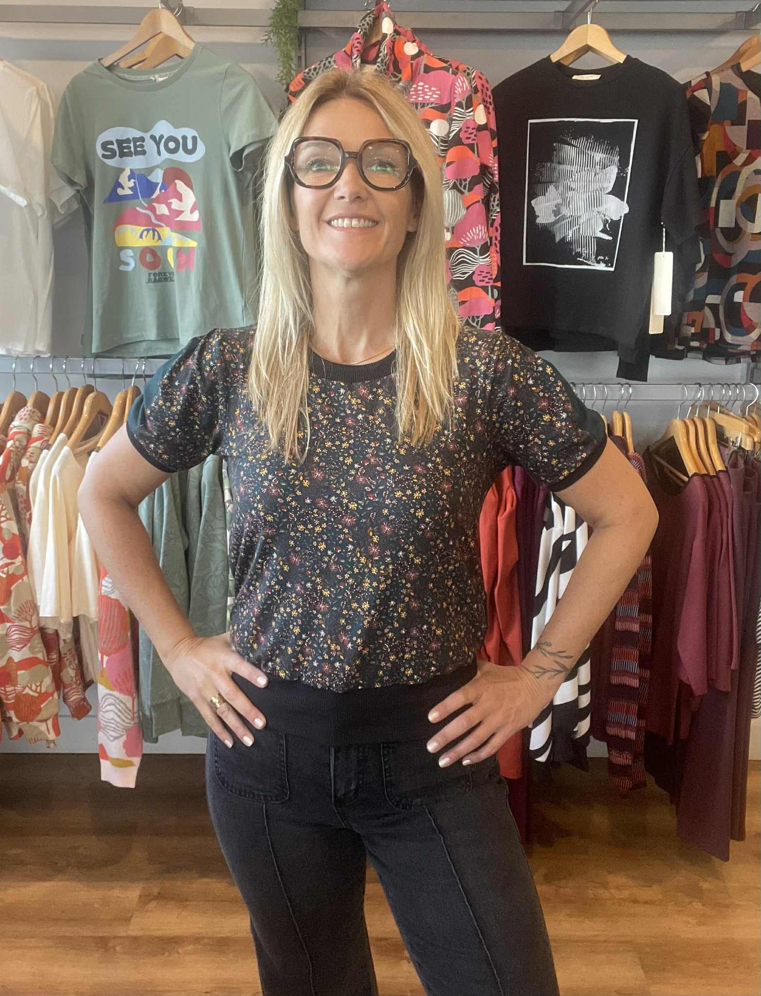 Chandail à manches courtes encolure ronde et élastique bande large à la taille.