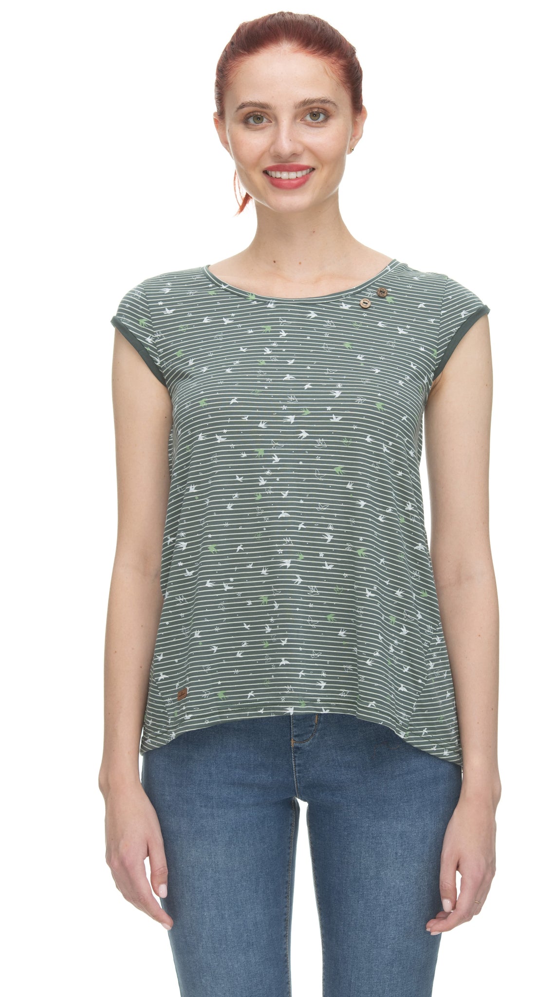 Chandail à manches courtes vert avec fines et petits oiseaux.