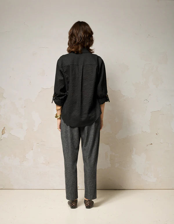 Élégante et confortable, la chemise Ania à manches longues est confectionnée dans un tissu léger et texturé, idéal pour le printemps ou les journées d’été plus fraîches. Ses manches se retroussent facilement grâce à des ganses ajustables maintenues par des anneaux. Elle se porte aussi bien seule que ouverte par-dessus une camisole.