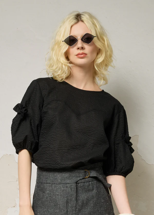 Haut à manches 3/4 resserrées au bas par un élastique, agrémenté d’un nœud décoratif délicat sur la manche. Il se distingue par une subtile découpe en forme de cœur à l’avant, qui apporte une touche féminine et originale. Une pièce idéale pour le printemps, à la fois légère et raffinée.