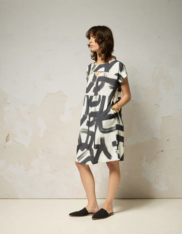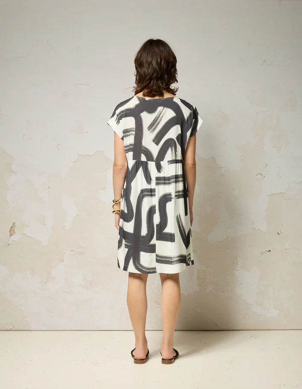 Jolie robe ample à manches courtes à même, soulignée de fronces à la taille qui structurent délicatement la silhouette. Son ouverture en forme de triangle à l’avant apporte un détail subtil et distinctif. Une robe confortable et facile à porter tout au long de l’été.