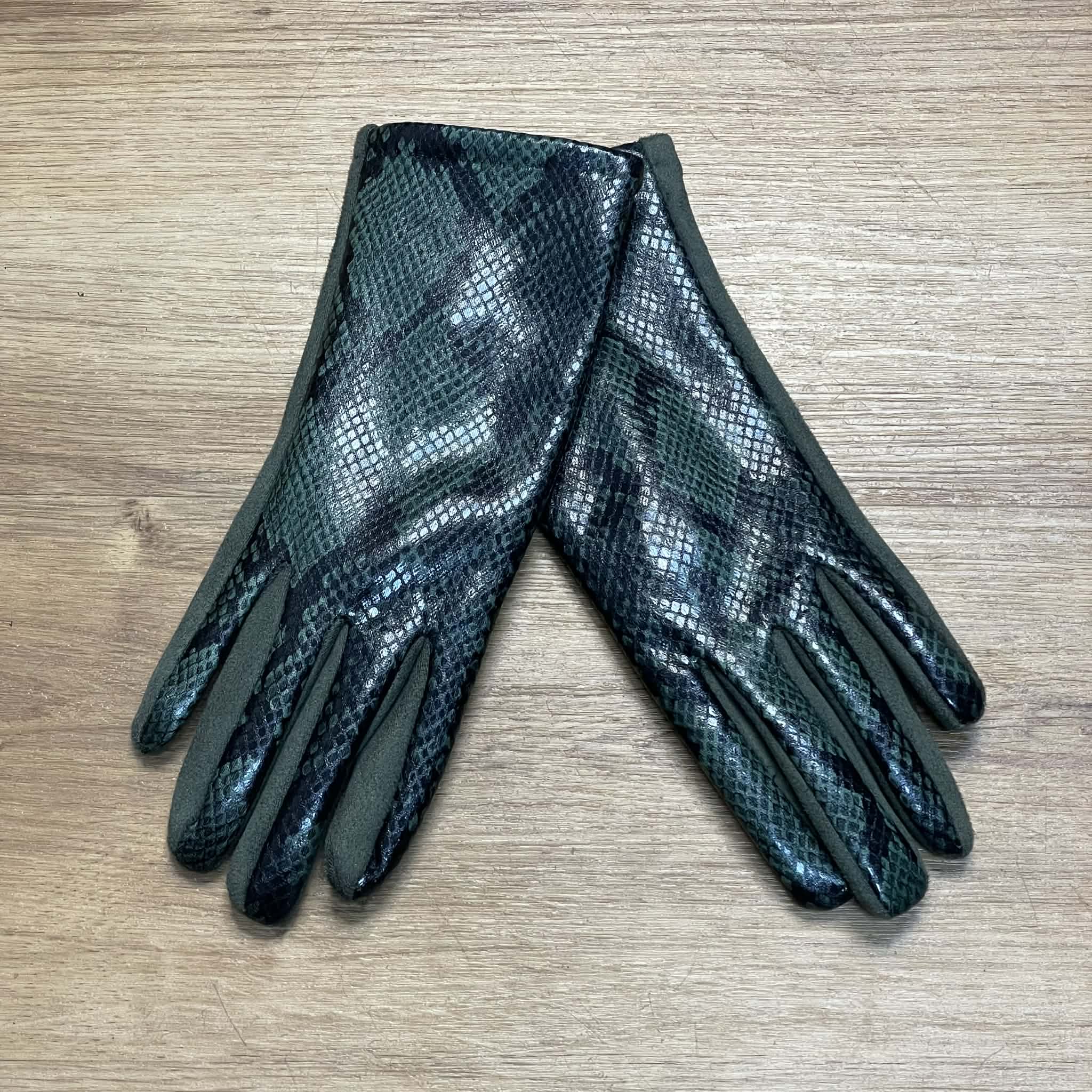 Gants en suède vert et cuir synthétique imitant la peau de serpent.