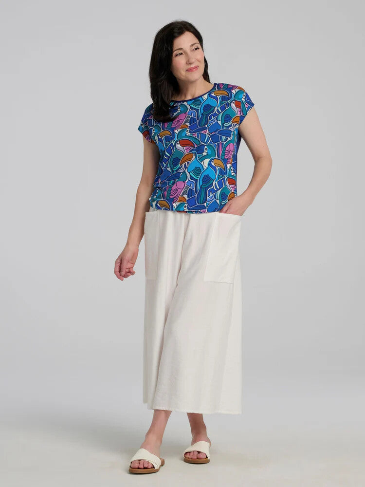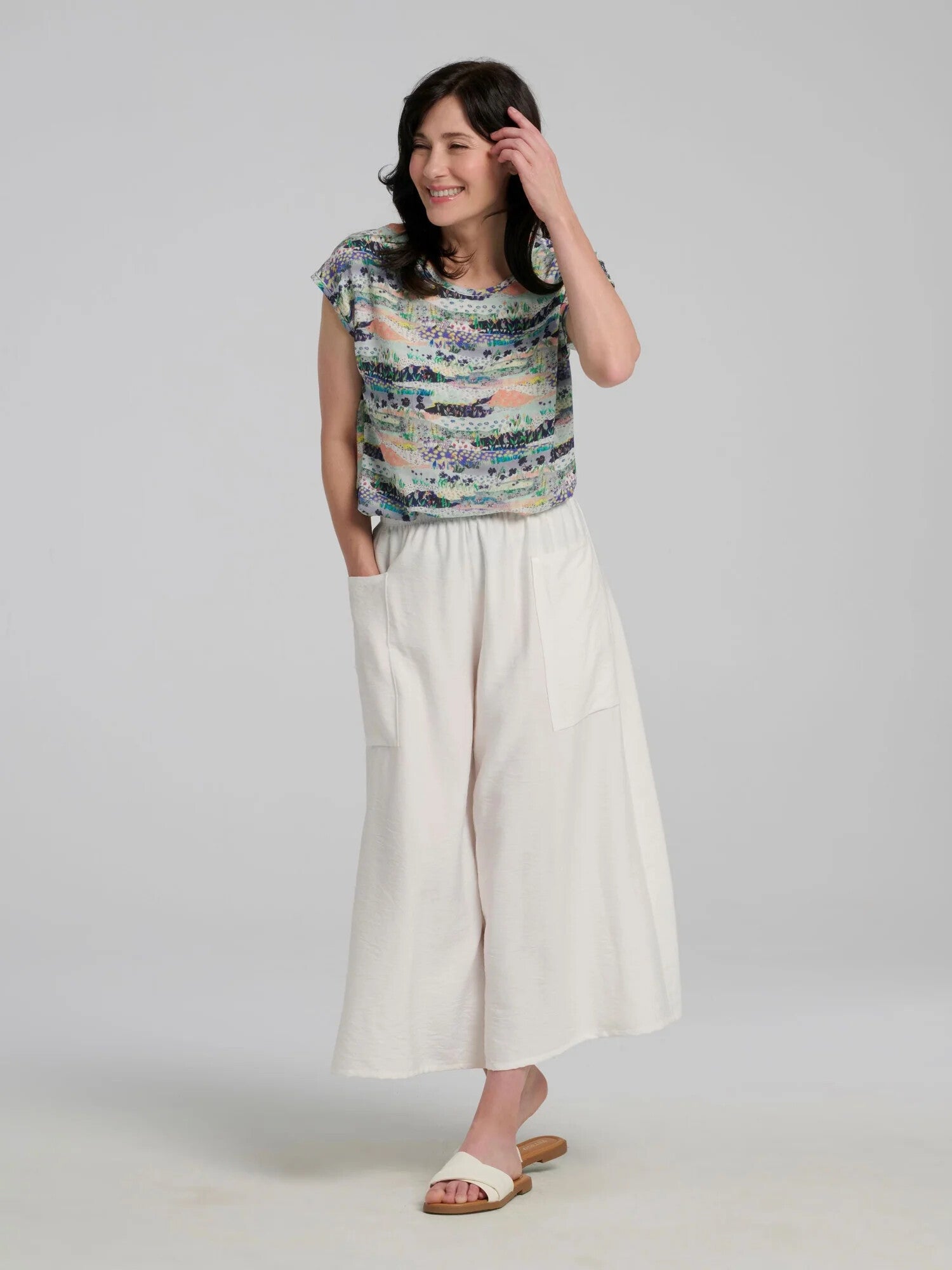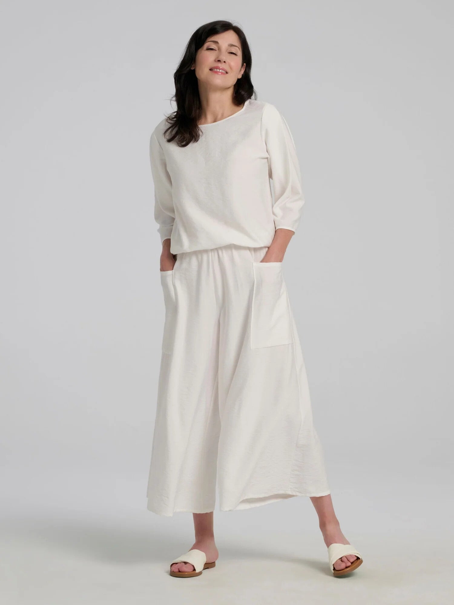 Ishtar, c’est le secret d’un été en douceur. Ce pantalon ample au tombé fluide est coupé dans une matière d’une légèreté exemplaire, parfaite pour les journées chaudes ou les valises de vacances. Sa coupe évoque presque une jupe longue, avec tout le confort d’un pantalon — notamment grâce à sa taille élastique et ses poches plaquées pratiques. Sa teinte blanche en fait une base idéale pour mettre en valeur les imprimés colorés ou les hauts texturés. Il se prête à une multitude de looks, en duo avec la camisole Tracy, la blouse Soraya ou tout autre favori de la saison. Son confort est tel qu’on oublie qu’on le porte — sauf lorsqu’on reçoit des compliments!