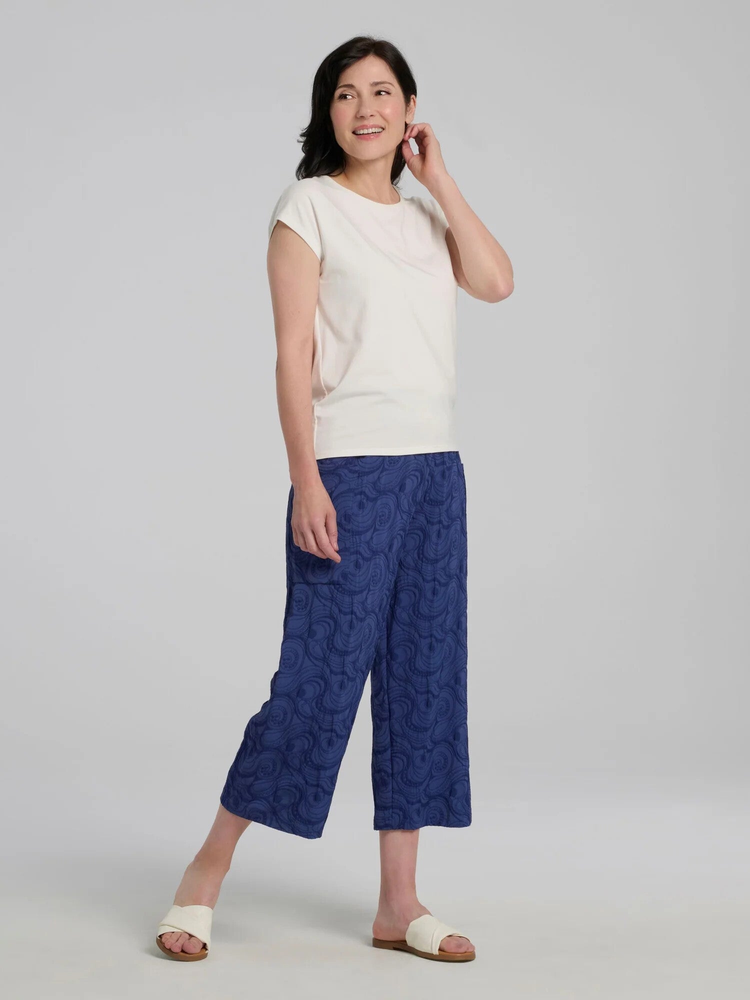 Le pantalon Sana allie une allure décontractée à une présence affirmée. Confectionné dans un jacquard tissé bleu au motif arrondi, il offre une tenue agréable et une texture souple qui épouse les mouvements sans perdre sa forme. Sa taille élastique et sa coupe droite légèrement raccourcie en font un essentiel du quotidien, facile à marier et toujours flatteur. Deux poches latérales accueillent aisément un téléphone ou un porte-monnaie — parfait pour les journées actives ou les balades improvisées. Son bleu profond lui confère une élégance tranquille, idéale pour composer des ensembles à la fois pratiques et distingués.