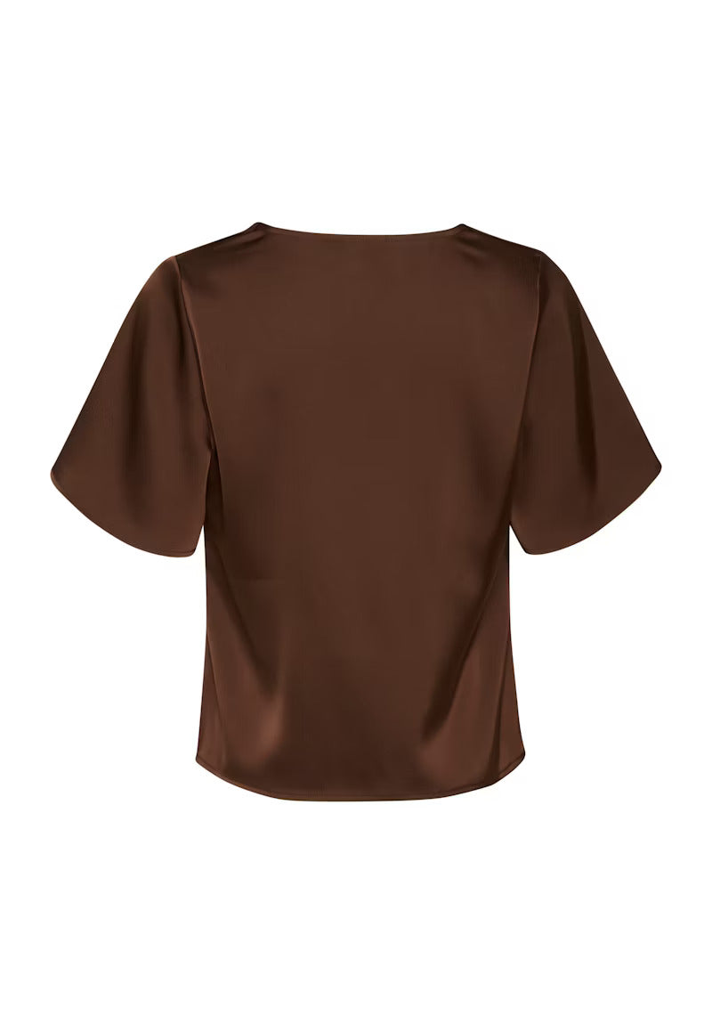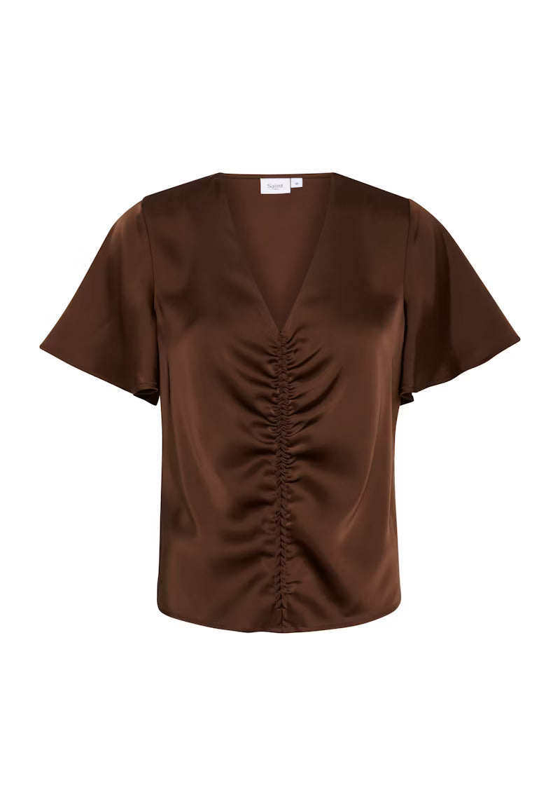 Magnifique blouse à manches au dessus du coude, col V avec devant plissé. Coupe semi ample.