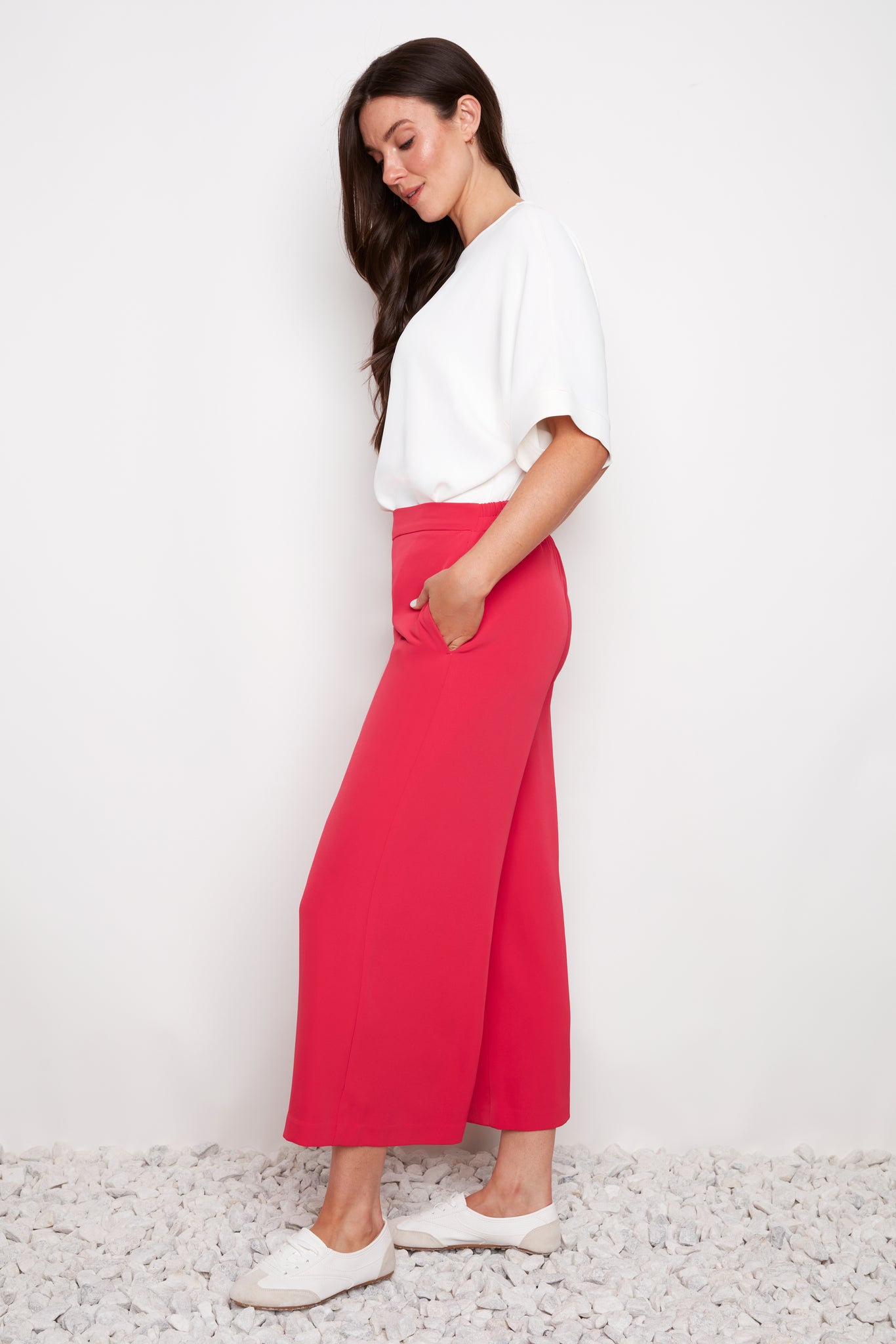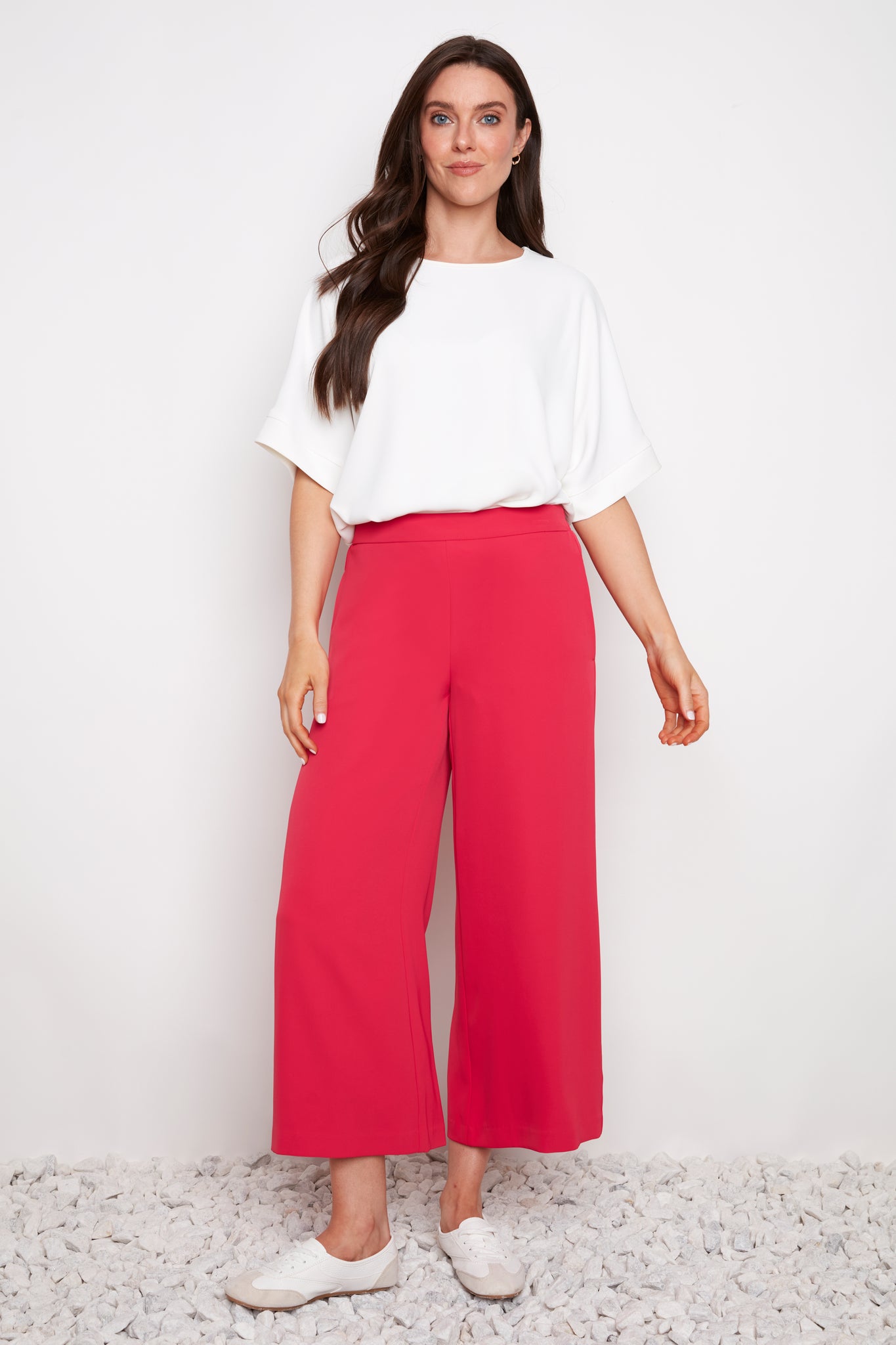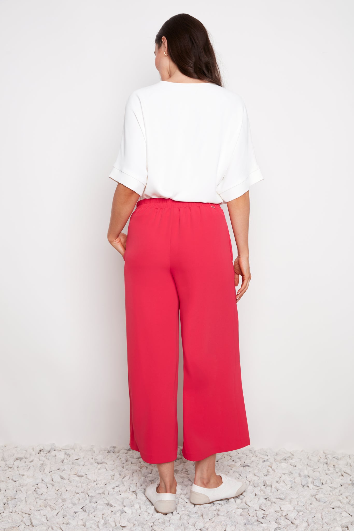 Pantalon rouge rosé jambe large longueur écourtée 25 pouces. Tissu doux et confortable. Taille élastique. Poches aux latérales.