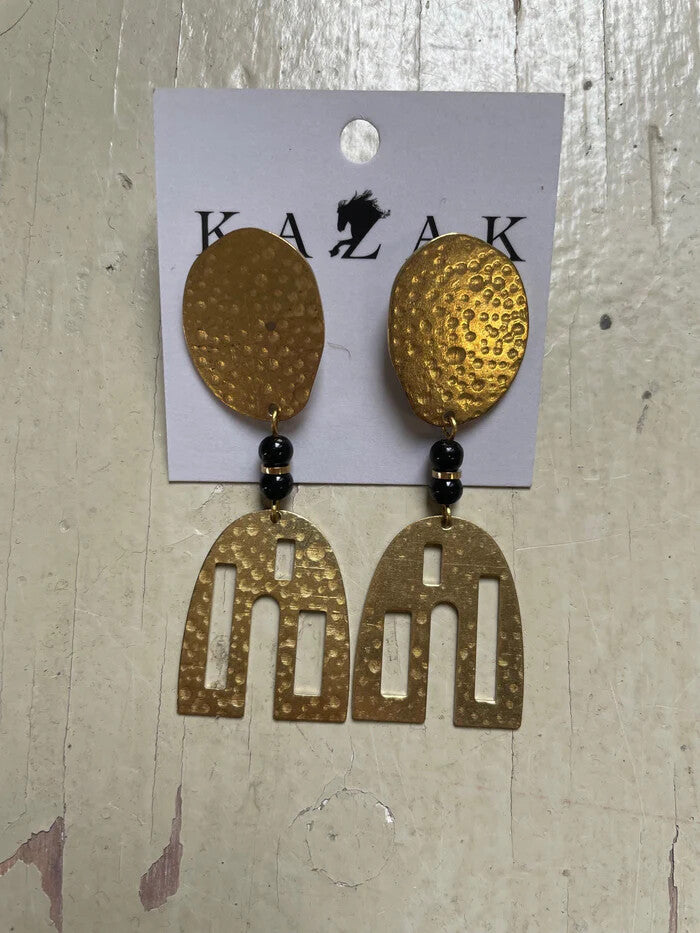 Boucles d'oreilles fait de laiton, de billes artisanales et de pierre semi précieuses.