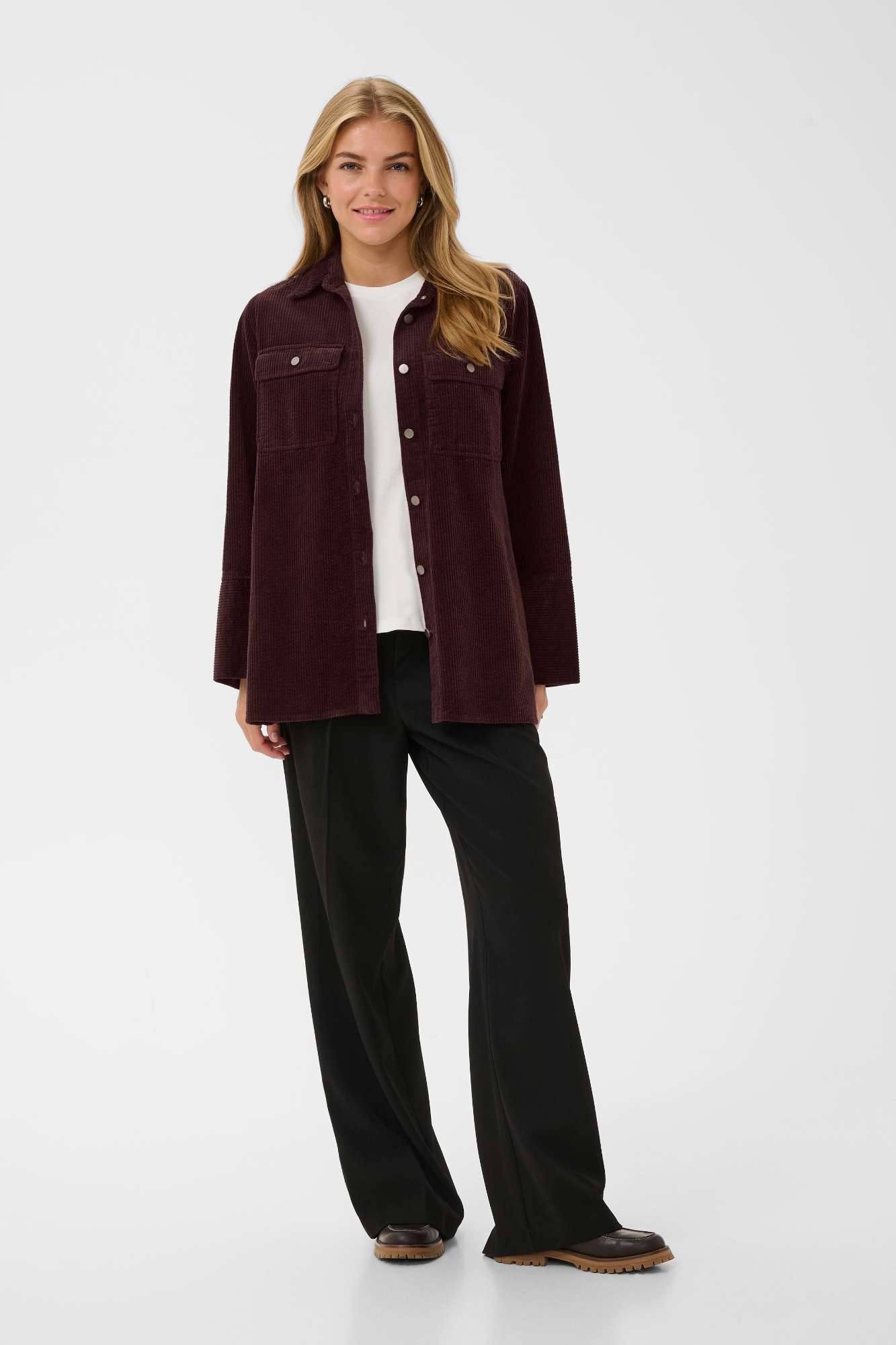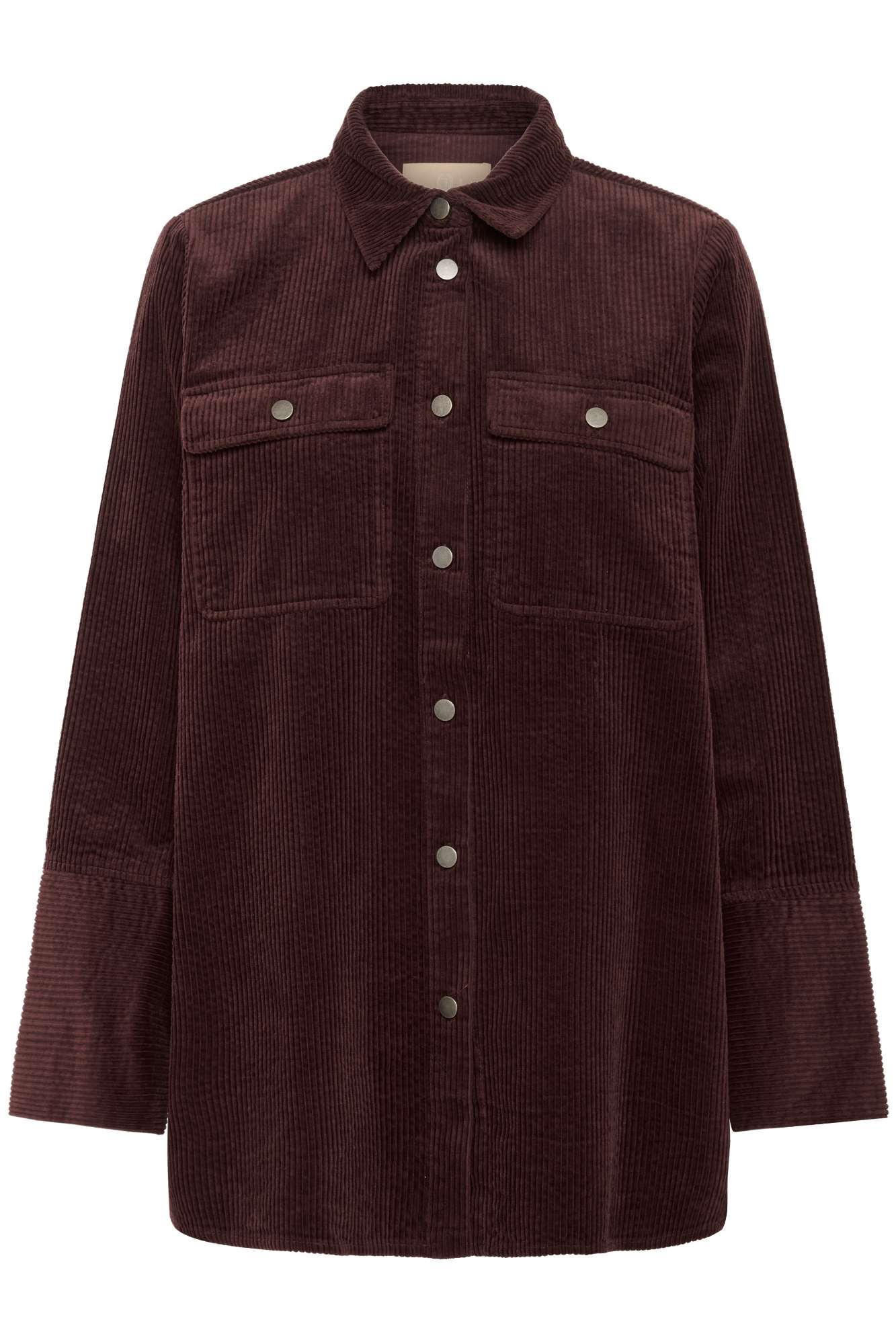 Chemisier ou veste en corduroy brun avec poches au devant. Coupe ample, mancjes longues, longueur aux hanches.