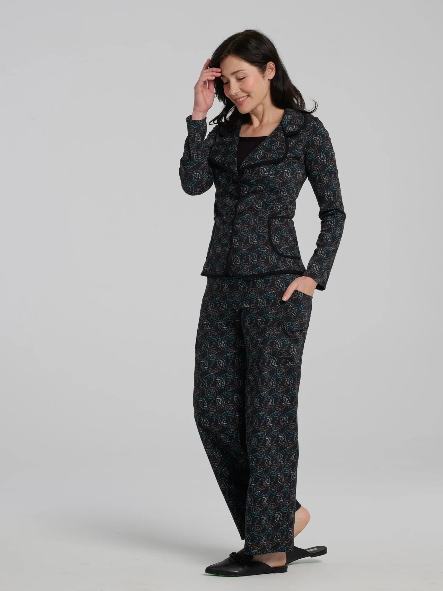Il existe des pièces qui imposent leur présence sans jamais hausser la voix. Nara en est l’exemple parfait. Son tissu extensible, relevé de motifs géométriques turquoise et brun, joue avec les contrastes avec une assurance qui ne passe pas inaperçue. Ajustée et coupée près du corps, elle s’arrête juste au-dessus des hanches pour dessiner une silhouette nette et contemporaine. Deux poches délicatement intégrées aux empiècements de côté apportent une touche de praticité discrète, tandis que le col tailleur arrondi et le biais qui souligne chaque bord ajoutent un raffinement maîtrisé. Portée fermée, elle structure l’allure avec assurance ; ouverte, elle se détend et révèle un esprit plus décontracté.